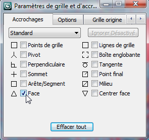 (Bascule Accrochages) avec le bouton droit de la souris pour afficher la boîte de dialogue Paramètres de grille et d'accrochage. Dans la boîte de dialogue, cliquez sur Effacer tout, puis activez l'option Face.