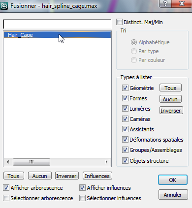 Dans la boîte de dialogue Fusionner, cliquez sur l'objet Hair_Cage pour le mettre en surbrillance, puis sur OK.