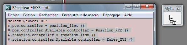 Fermez la boîte de dialogue Personnaliser interface utilisateur, puis positionnez la nouvelle barre d'outils à droite de la fenêtre Récepteur MAXScript.
