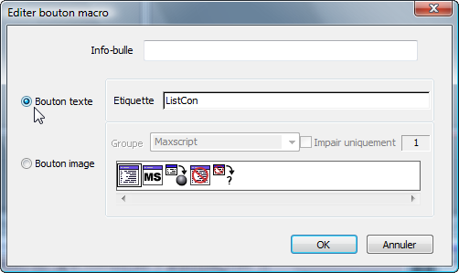 Fermez la fenêtre Récepteur MAXScript, puis redimensionnez la barre d'outils mesOutils jusqu'à ce que l'étiquette Liste Cont s'affiche entièrement.