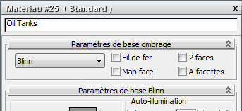 Vous avez utilisé les commandes des matériaux de base, Couleur diffuse, Niveau spéculaire et Lustre pour créer un matériau simple qui ressemble à une peinture légèrement étincelante. La création du matériau des citernes est terminée.