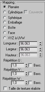 zone Mapping, choisissez Boîte. Les boutons situés au-dessus de la zone Mapping (Planaire, Cylindrique, Sphérique, etc.) indiquent au modificateur Map UVW comment projeter la map sur l'objet. La correspondance boîte projette la map depuis les six côtés, l'affichage de la texture est donc plus uniforme.