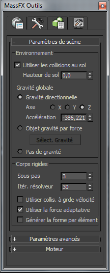 (Paramètres d'univers). 3ds Max ouvre la boîte de dialogue Outils MassFX dans le panneau Paramètres d'univers.