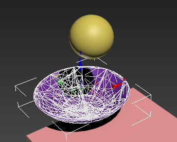 (Démarrer la simulation). Une courte pause se produit tandis que 3ds Max effectue les calculs, puis la balle tombe dans le bol, rebondit légèrement et finit par tomber de la table en roulant, entraînant le bol avec elle.