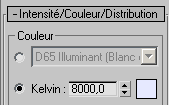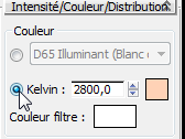 - Dans le panneau déroulant Intensité/Couleur/Atténuation, choisissez l'option Kelvin (température de la couleur) pour modifier la couleur de la lumière en un jaune doux (2800 K).