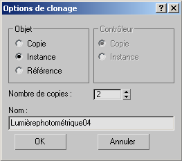 3ds Max ouvre une boîte de dialogue Options de clonage. Dans la boîte de dialogue