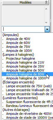groupe de fonctions Modifier. Dans le panneau déroulant Modèles, ouvrez la liste déroulante et choisissez Ampoule halogène 80 W.