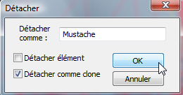 - Dans la boîte de dialogue Détacher, activez l'option Détacher comme clone. Nommez les faces détachées Moustache et cliquez sur OK.