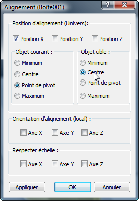 zone Position d'alignement (Univers), vérifiez que Position X est activé et que Position Y et Position Z sont désactivés. Choisissez Point de pivot dans la zone Objet courant et Centre dans la zone Objet cible, puis cliquez sur OK.