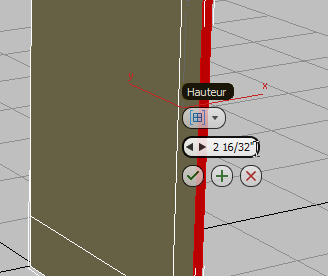groupe de fonctions Modifier puis, dans le panneau déroulant Paramètres, entrez 21,0 dans le champ Longueur, 0,75 dans le champ Largeur sur 34,5 dans le champ Hauteur. Dès que vous saisissez les valeurs, elles sont converties en pouces et en fractions de 1/32 de pouce, selon la configuration des unités définie dans le fichier de scène.