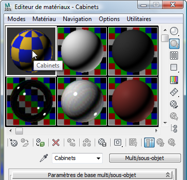 - Cliquez sur le champ échantillon supérieur gauche pour l'activer. Le matériau de ce champ est nommé Cabinets (Meubles).