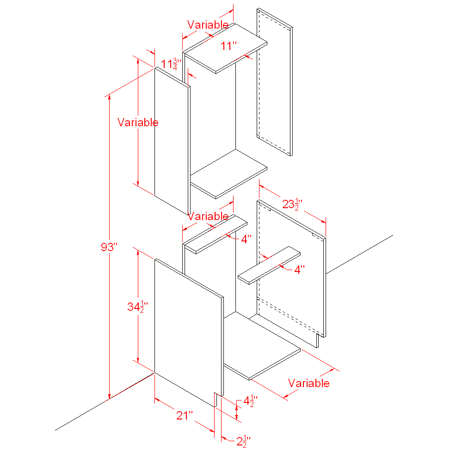 La largeur est basée sur la largeur complète du meuble (18 pouces) moins la largeur de 3/4 pouces de chaque groupe de fonctions latéral, moins l'espace de 1/8 pouce prévu pour retirer l'étagère si nécessaire.