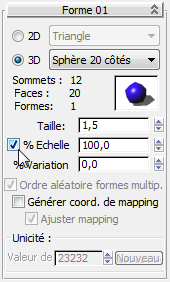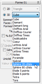 - Dans le panneau déroulant Forme, gardez l'option 3D sélectionnée, puis choisissez Sphère 20 côtés dans la liste déroulante 3D.