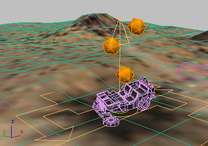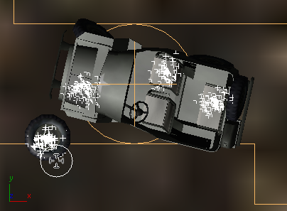 visualisez l'animation. Les braises sont propulsées depuis la jeep avant de retomber sur le sol. Elles sont plus faciles à voir dans la fenêtre Perspective. Elles sont d'assez grande taille, mais comme pour les particules de fumée, le matériau appliqué permet d'en corriger l'aspect. La création de ce matériau est le sujet de la procédure suivante.