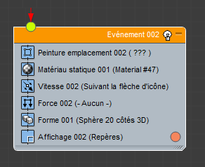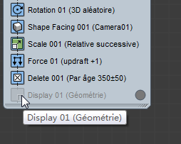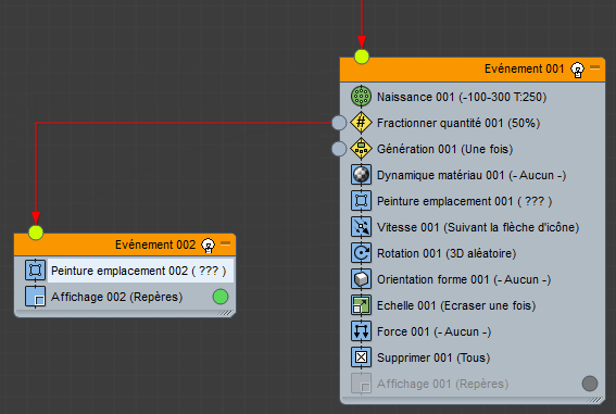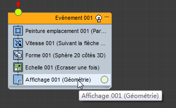 Lorsque vous déposez un événement (un opérateur, un test, etc.) dans la zone vide de l'affichage des événements, le système Flux de particules crée un nouvel événement. A l'origine, le nouvel événement contient l'opérateur que vous avez déposé et un opérateur Affichage.