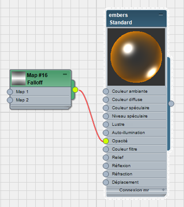 - Faites glisser une texture Atténuation du navigateur vers la vue Braises et reliez-la au composant Opacité du matériau Braises.