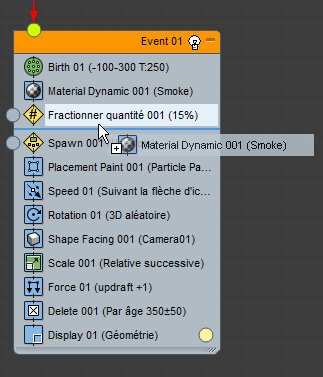Le déplacement de l'opérateur Dynamique matériau permet d'affecter aux particules de braise un matériau différent de celui des particules de fumée.