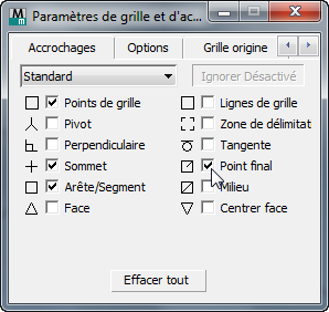 Remarque : Contrairement aux paramètres des unités, les paramètres des accrochages ne sont pas enregistrés avec la scène, même si 3ds Max les mémorise d'une session à l'autre.