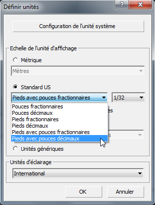 Remarque : Laissez la configuration de l'unité système telle qu'elle est. Celle-ci doit être modifiée uniquement pour réinitialiser l'unité système sur le paramétrage par défaut (pouces) après avoir chargé un fichier qui utilise une unité système différente ou si vous travaillez sur des fichiers tellement énormes ou minuscules que les valeurs n'apparaissent pas correctement dans les champs d'entrées numériques.