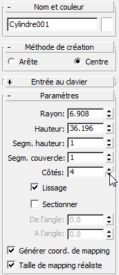- Dans le panneau déroulant Paramètres, modifiez les segments hauteur sur 1, puis modifiez les côtés sur 4.