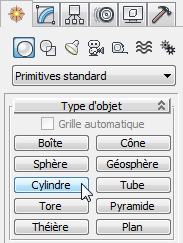 (Géométrie). Assurez-vous que l'option Primitives standard est sélectionnée dans la liste déroulante, puis cliquez sur Cylindre dans le panneau déroulant Type d'objet. Le bouton Cylindre est mis en surbrillance pour indiquer qu'il est actif et prêt à être utilisé.