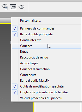- Par défaut, la barre d'outils Couches est masquée lorsque vous lancez 3ds Max. Si elle n'est pas ouverte, cliquez avec le bouton droit de la souris sur un espace vierge sur la barre d'outils principale et sélectionnez Couches dans le menu déroulant.