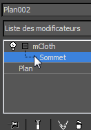 Pile des modificateurs, développez l'entrée mCloth afin d'afficher le niveau de sous-objet Sommet. Cliquez sur l'entrée Sommet.