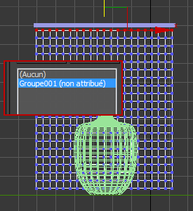 La liste du panneau déroulant Groupe affiche à présent le groupe que vous venez de créer, Group001, ainsi que son état non affecté. Vous allez affecter une contrainte Noeud au groupe, ce qui signifie que ces sommets seront "collés" à la tringle lors de la simulation.