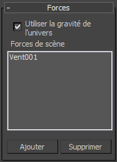 Panneau déroulant Forces, cliquez sur Ajouter et sélectionnez la déformation spatiale Vent. Le nom de la déformation spatiale s'affiche dans la liste Forces de scène appliquées.