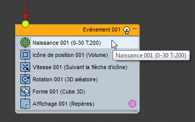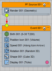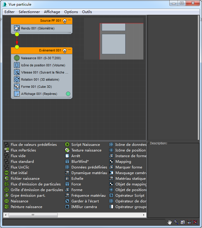 Vue particule est l'interface principale des systèmes de flux de particules. C'est là que vous ajoutez et ajustez le comportement des particules. Les principales zones de cette fenêtre sont la zone d'affichage des événements, dans la partie supérieure gauche, qui affiche les événements que vous venez de créer, et la zone de "dépôt", en bas à gauche, qui contient les opérateurs que vous pouvez ajouter dans la zone d'affichage des événements.