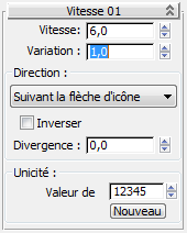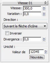 Dans le panneau Paramètres situé sur la droite de la vue particule, 3ds Max remplace le panneau déroulant Naissance par un panneau déroulant Vitesse.