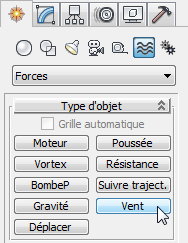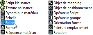 3ds Max affiche les paramètres de l'opérateur Force dans un panneau déroulant, dans le panneau Paramètres de droite.