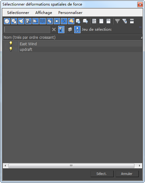 3ds Max ouvre une boîte de dialogue Sélectionner déformations spatiales de force.