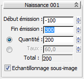 Dans la partie droite de la vue particule, 3ds Max affiche le panneau déroulant Paramètres de l'opérateur Naissance. Comme les champs l'indiquent, l'opérateur Naissance génère 200 particules au total. Il commence à émettre des particules au niveau de l'image 0, puis s'arrête à émettre à l'image 30.