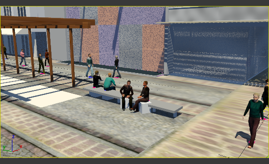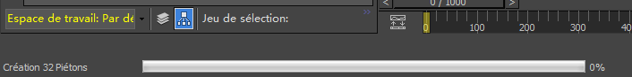Après quelques secondes de calcul, la commande Peupler place des personnages animés au niveau des espaces réservés. Pendant la création de la simulation, une barre de progression s'affiche sur la ligne d'état située dans la partie inférieure de la fenêtre de 3ds Max.
