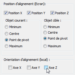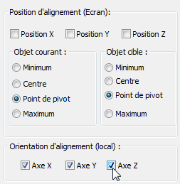 zone Position d'alignement de la boîte de dialogue Alignement, désactivez Position X, Position Y et Position Z. Dans la zone Orientation d'alignement, activez Axe X, Axe Y et Axe Z.