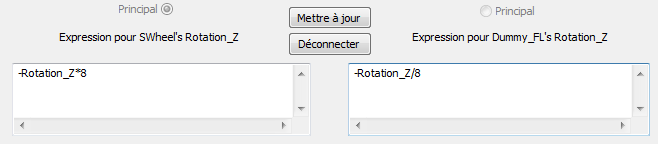 - Dans le groupe de fonctions Expressions de gauche, sous "Expression pour la Rotation_Z de SWheel", entrez –Z_Rotation*8.