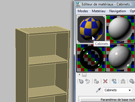 - Cliquez sur le champ échantillon supérieur gauche pour l'activer. Le matériau de ce champ est nommé Cabinets (Meubles).