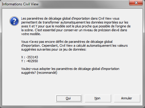 Lorsque les données de conception de génie civil sont basées sur les données géodésiques, l'intervalle des coordonnées peut être très large et décalé par rapport à l'origine (0,0). Si vous chargez des données sans modifier l'origine, la fenêtre peut se comporter de façon étrange, mais cela peut surtout entraîner une imprécision au niveau de la modélisation en raison d'erreurs d'arrondi. Pour éviter ces problèmes, utilisez toujours l'option Décalage globale d'importation.