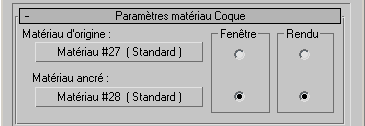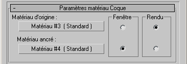 Lorsque le panneau déroulant apparaît, le matériau Coque contient deux types de matériau : le matériau de plan affecté à l'origine, qui s'affiche uniquement lorsque le rendu est généré, et le matériau ancré obtenu à partir de l'objet source, qui s'affiche uniquement dans les fenêtres.