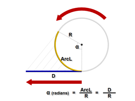 Pour un objet circulaire, le degré de rotation (α) est défini par le rayon du cercle et la longueur de l'arc compris dans l'angle α. Le degré de rotation (α), exprimé en radians, est égal à la longueur de l'arc, divisée par le rayon du cercle (longueur arc / R), où :