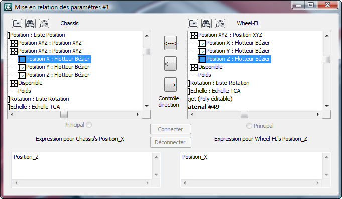 - Dans la boîte de dialogue Mise en relation des paramètres, cliquez sur la flèche droite située au-dessus de "contrôle direction" pour vérifier que la position Y de Châssis contrôle la rotation Z de Wheel-FL.