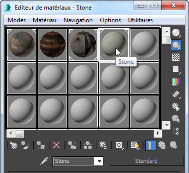 (Afficher les matériaux ombrés dans la fenêtre). Ce bouton se trouve dans la rangée de boutons située sous les échantillons. Si vous ne pouvez pas voir le champ échantillon du matériau Pierre, cliquez avec le bouton droit de la souris sur l'un des champs échantillons et sélectionnez Fenêtres échantillon 5 X 3 pour afficher plusieurs champs.