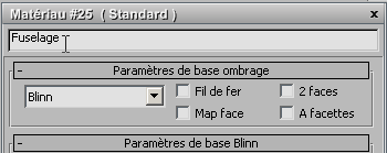 - Cliquez deux fois sur le noeud de matériau Standard de façon à en afficher les paramètres dans le groupe de fonctions Editeur de paramètres sur la droite. Nommez le nouveau matériau Fuselage.