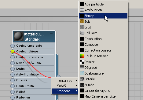 - Dans la vue active, faites glisser un fil du connecteur d'entrée Couleur diffuse du noeud de matériau Fuselage, puis relâchez le bouton de la souris. Choisissez Standard
