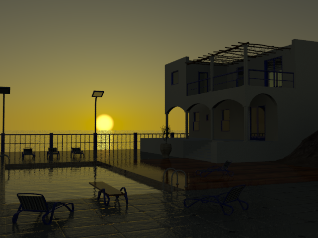 L'ombrage Ciel physique mr produit un dégradé vif du ciel et les détails autour de la piscine sont beaucoup plus visibles.
