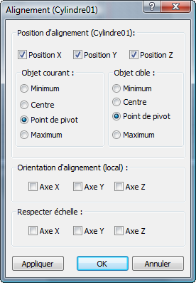 - Dans la boîte de dialogue Alignement (Cylindre01)