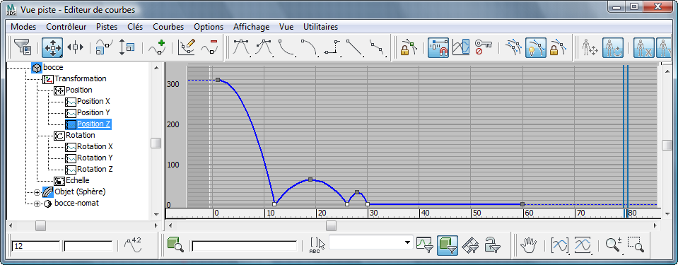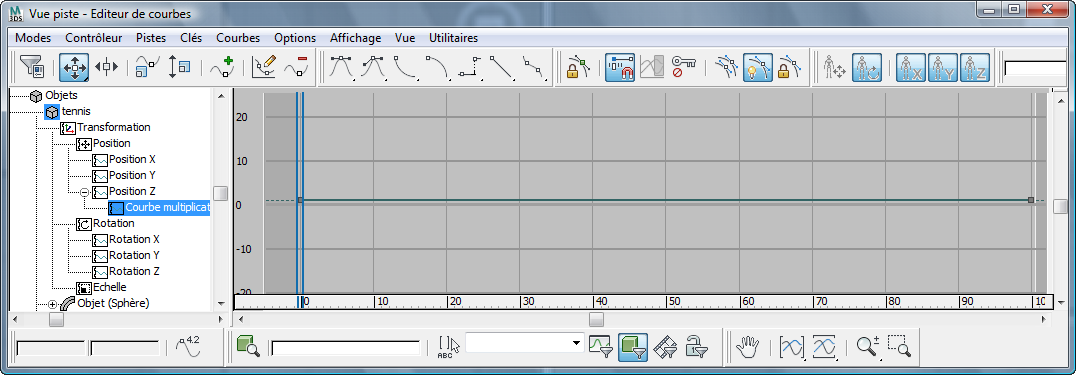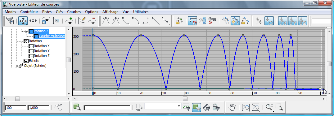 Appliquer courbe multiplicateur. 3ds Max ajoute une courbe de multiplicateur à la piste Position Z. Il est également possible de modifier l'affichage de la fenêtre de courbe afin que toutes les courbes soient visibles.