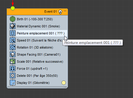 Il est possible de copier l'icône Flux de particules initiale à d'autres endroits de la scène. Au lieu de cela, nous allons utiliser un opérateur spécial, Peinture emplacement, pour générer des sources de fumée supplémentaires à partir du système Flux de particules.