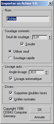 - Utiliser seuilLorsque cette option est activée, l'importation STL utilise la méthode de soudage standard de 3D Studio. Le processus peut se révéler très lent.